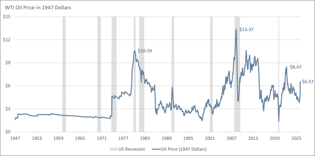 The chart of inflation-adjusted WTI oil prices highlights an important but often overlooked point: oil is not overly expensive by historical standards. While nominal prices today may appear high, adjusting for inflation shows that current levels, roughly $6.5 in 1947 dollars, are well below past peaks. By comparison, oil prices surged to over $10 in real terms during the late 1970s and early 1980s and reached an even higher peak of about $13.4 in 2008. In other words, today’s oil prices are significantly lower in real purchasing power terms than during some of the most economically disruptive energy shocks of the past half-century.