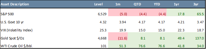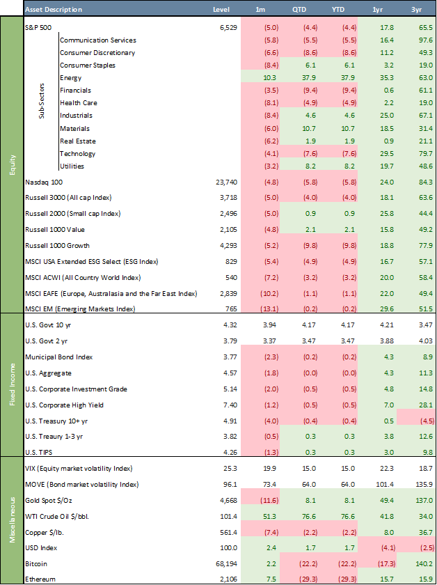 - U.S. equities declined sharply, with the S&P 500 down 5.0% in March (-4.4% YTD) and the Nasdaq 100 down 4.8% (-5.8% YTD), pressured by AI valuation concerns, tariff uncertainty, and escalating geopolitical tensions.