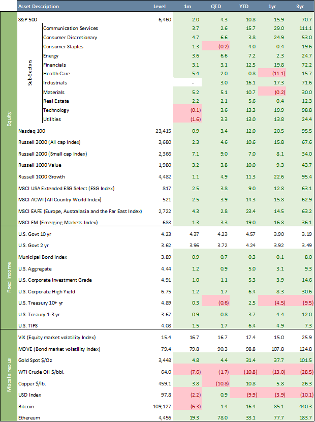 - Small-cap stocks outperformed, with the Russell 2000 gaining 7.0%, while international markets led overall gains—MSCI EAFE rose 23.4% and MSCI EM climbed 19.0% YTD.