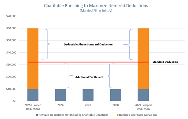 With the passing of the One Big Beautiful Bill Act on July 4, 2025, there are a few changes to deducting charitable donations. Beginning in 2026, taxpayers who take the standard deduction can now deduct up to $1,000 in cash donations (or $2,000 for those filing jointly) to certain charities above the line. This deduction is in addition to the standard deduction amounts for 2025, which are $15,750 for single filers and $31,500 for married couples filing jointly. Larger donations to 501(c)(3) charities result in an itemized deduction, which reduces taxable income for taxpayers who itemize. Also beginning in 2026, there is a new .5% floor, or hurdle, that charitable donations need to exceed to be deductible. This means that beginning next year, there will be a (relatively small) reduction in tax benefit for itemized charitable donations. For some clients, it may be a good idea to accelerate charitable donations before the end of 2025 to maximize the tax benefit. Additionally, the best way to give might be to switch from giving annually to giving every few years. “Bunching” two or three years’ worth of charitable donations into one year might result in itemizing deductions in that year while taking advantage of the now higher standard deduction for the other years (example of married filers in the chart below). Cumulatively, this results in greater tax deductions, which translates to tax savings. If you would like to bunch gifts for tax purposes while benefiting the charity over time, consider using a donor advised fund (discussed below), which allows you to take the charitable deduction in the year of the gift but allows you to make distributions to the charities over time.